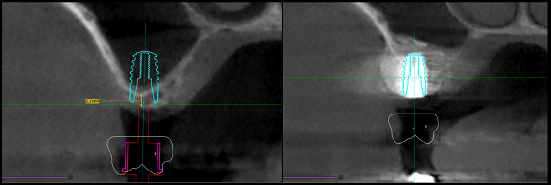 Image above depicting implant planning with 3D imaging. The left image shows where the implant should be according to the correct crown position. The implant can be seen located into the sinus, thus a sinus lift and bone graft were performed with a simultaneous implant placement in the desired position.